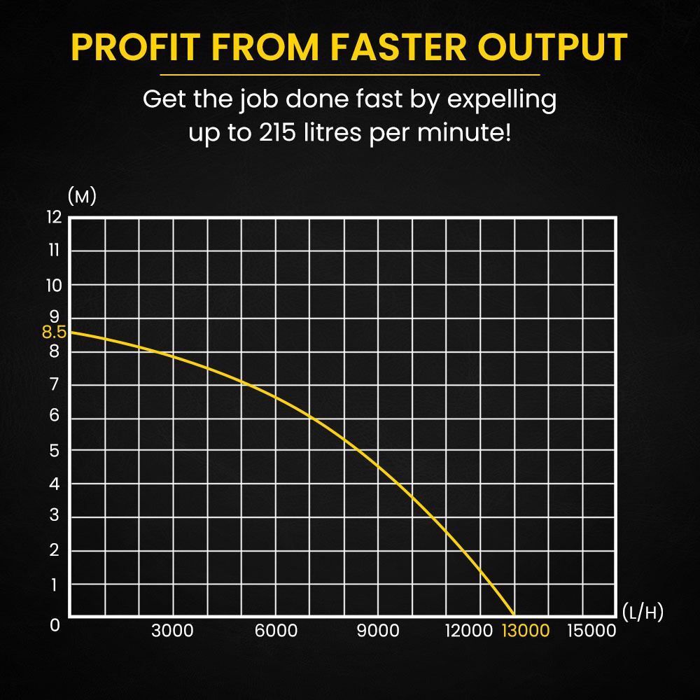 This exceptional pump brings enormous capacity in a compact unit and is sure to give you peace of mind during periods of heavy rainfall and flood recovery. With a powerful one horsepower (750 watt) motor, it can expel up to a massive 13,000 litres per hour, and has an impressive 8.5 metre maximum head capability!