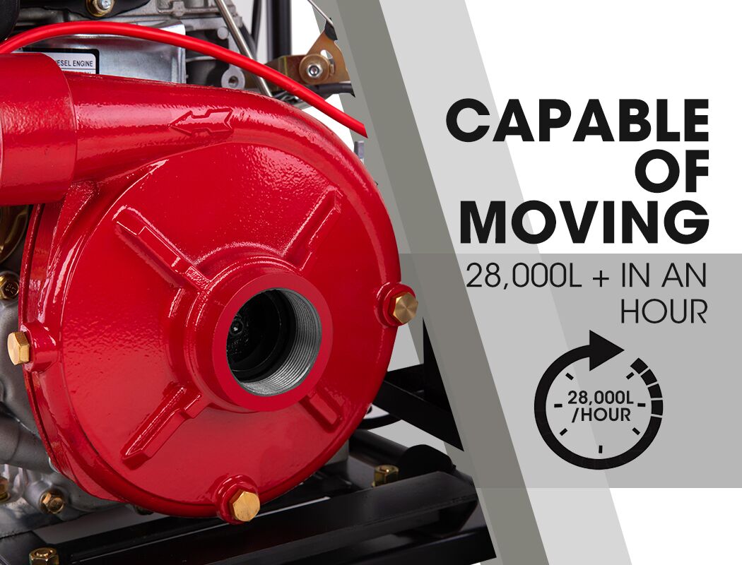These units are at the height of their class with an extensive list of features. Electric key start-fires your 8HP pump into instant action maintaining huge pressure at 28,000LPH. Meanwhile, the full size diesel tank saves you running back to the shed for more gas! Its cast iron pump housing has superior pressure holding compared to aluminum versions and features a single outlet – a fantastic feature for watering grounds and related applications.